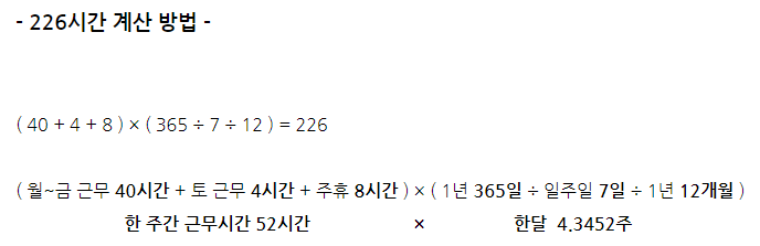 그러나 이전에는 주당 근무시간이 44시간이었기 때문에, 이를 기준으로 월 근무시간을 계산하면 대략 226시간이 됩니다. 이는 각각의 근무시간 기준에 따른 차이를 보여주며, 이를 통해 근무시간이 임금에 어떻게 영향을 미치는지 이해할 수 있습니다.
