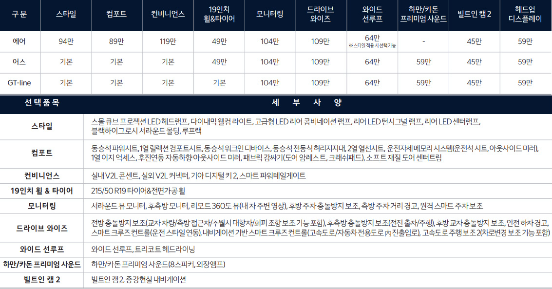GT-라인 스탠다드는 4,666만 원으로, 스포티한 디자인과 성능을 원하는 분들에게 적합한 모델입니다. GT 전용 외장 디자인과 20인치 휠이 적용되어 있어 외관부터 멋스럽습니다. 81.4 kWh 배터리가 기본으로 탑재되어 있으며, 다양한 주행 모드를 통해 운전의 재미를 더해줍니다. 열선 시트와 열선 스티어링 휠, 무선 충전 시스템 등 다양한 편의 기능들도 기본으로 제공됩니다.