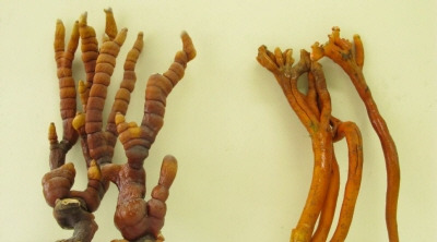 갓이 나오기 전 야생 영지버섯(왼쪽)과 붉은사슴뿔버섯 (오른쪽) 출처 : 미디어생활(https://www.imedialife.co.kr)