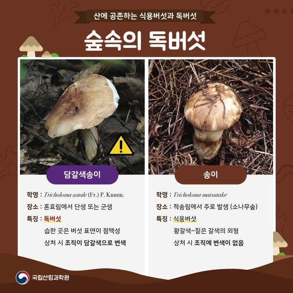 가장 많이 독버섯과 헷갈려서 목숨을 앗아가는 버섯, 송이버섯입니다. 송이버섯이 비싼 식재료인 만큼 산에서 송이버섯 비슷한 것만 보여도 일단 줏어먹고 보는 **분들이 매년 그렇게 세상을 하직하십니다. 늙어도 추해지지 마십시다.
