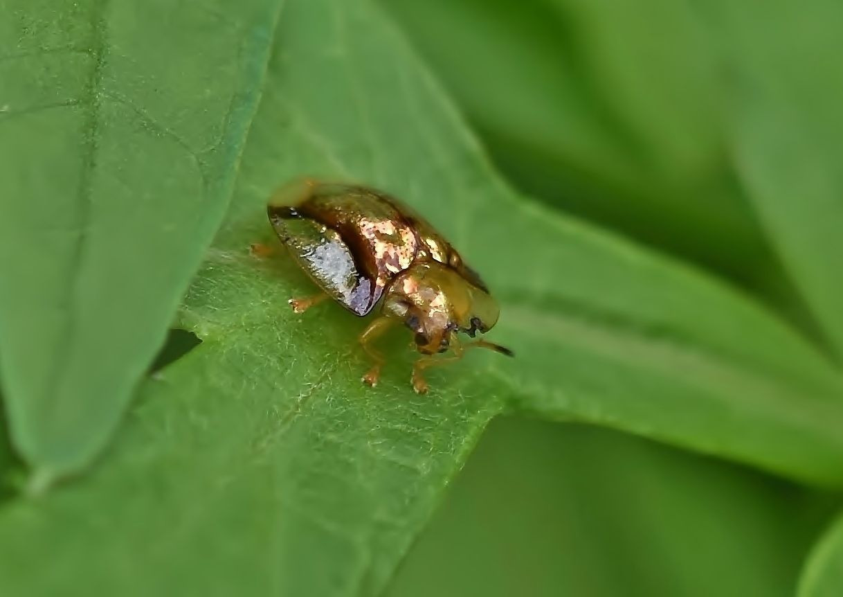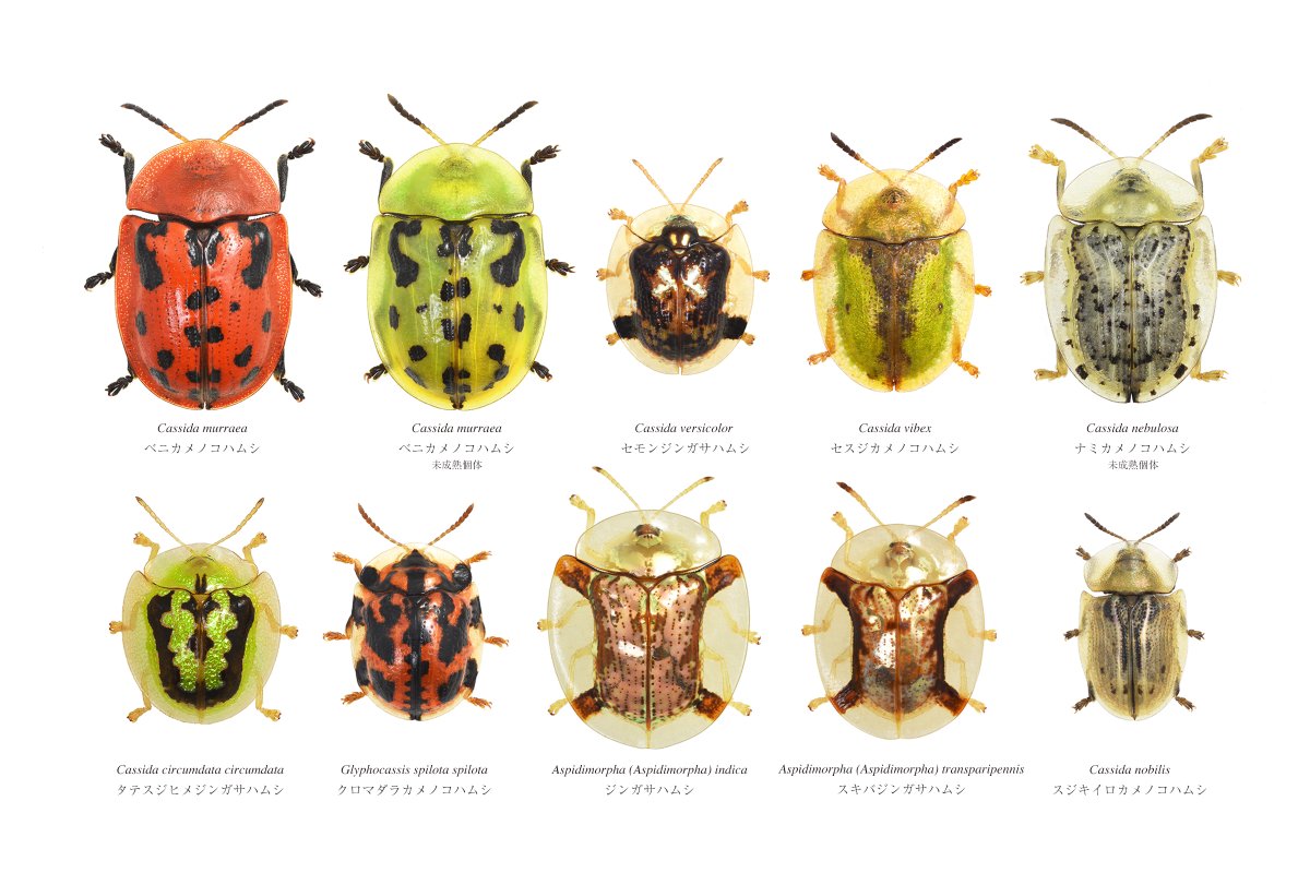 모시 금자라 남생이 잎벌레는 그 이름에서 알 수 있듯이 금빛을 띤 외모가 특징입니다. 몸길이는 약 7.0~8.5mm로, 작은 크기에도 불구하고 눈에 띄는 아름다움을 지니고 있습니다. 몸의 색상은 주로 투명하고 적금색을 띠며, 특히 겉날개는 금빛으로 빛나 자라처럼 생긴 외모를 자랑합니다. 살아있는 상태에서는 이 금빛이 매우 찬란하게 빛나지만, 표본으로 보존할 경우 그 아름다움이 사라지는 점이 안타깝습니다.