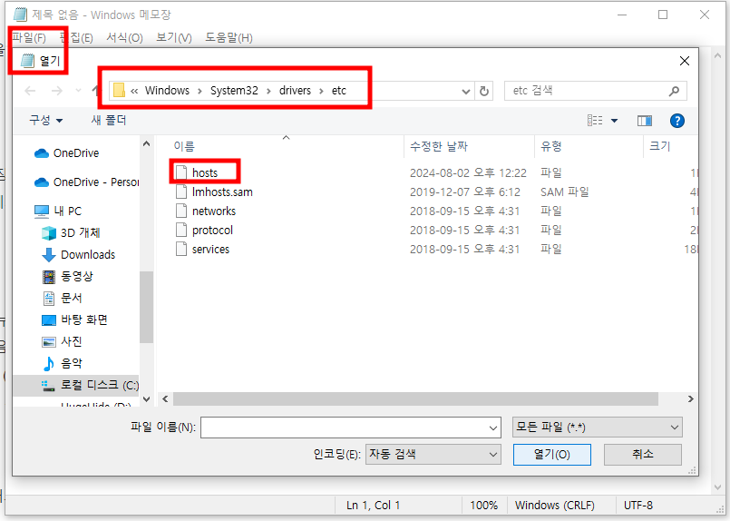 C:\Windows\System32\drivers\etc - 모든 파일 설정: 파일 형식을 “모든 파일 (.)”로 선택하여 hosts 파일이 나타나도록 합니다.